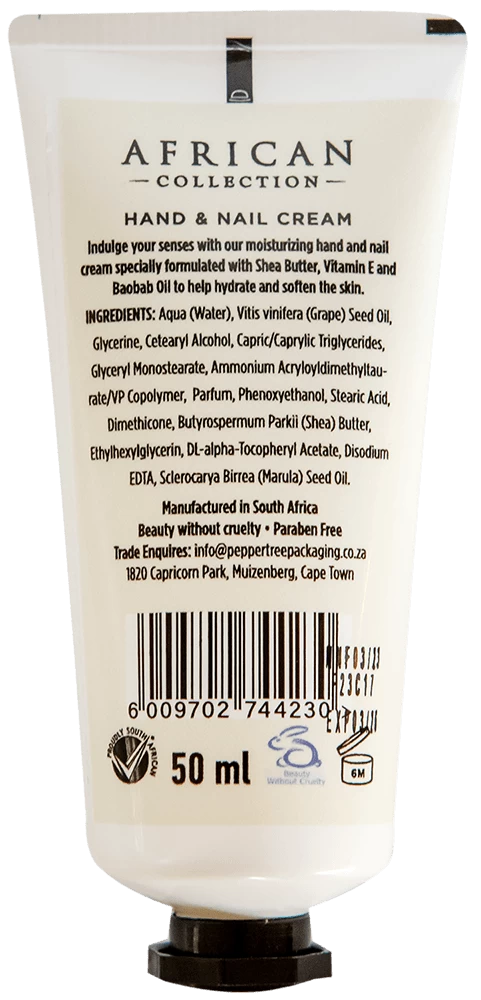 Indulge your senses with our moisturizing hand and nail cream specially formulated with Shea Butter, Vitamin E and Marula Oil to help hydrate and soften the skin.